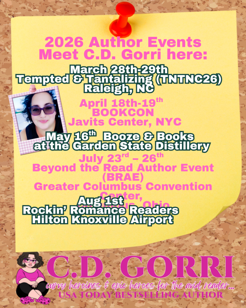 ✨📚 2026 AUTHOR EVENTS – COME SEE ME! 📚✨ Posted on February 25, 2026 | by C.D. Gorri ✨📚 2026 AUTHOR EVENTS – COME SEE ME! 📚✨ I absolutely love meeting readers in person, and 2026 is shaping up to be such an amazing year already! If you’re planning to attend any of these events, make sure to add me to your must-visit list 💕 Here’s where you can find me: 💋 March 28–29Tempted & Tantalizing (TNTNC26)Raleigh, NChhttp://www.tntnyc.net 📖 April 18–19BOOKCONJavits Center – NYChttps://www.bookcon.com/en-us.html 🥃📚 May 16Booze & BooksGarden State Distillery – NJhttps://www.facebook.com/groups/boozeandbooksnj ✨ July 23–26Beyond the Read Author Event (BRAE)Greater Columbus Convention CenterColumbus, Ohiohttps://www.beyondthereadauthorevent.com 🎸💕 August 1Rockin’ Romance ReadersHilton Knoxville AirportKnoxville, TNhttps://rockinromancereaders.com I’ll have special editions, signed paperbacks, exclusive goodies, and all the romance—paranormal, contemporary, darkish, steamy, and everything in between. Come say hi, grab a book, and let’s celebrate love, magic, and happily ever afters together 💖✨ Who am I seeing in 2026?!