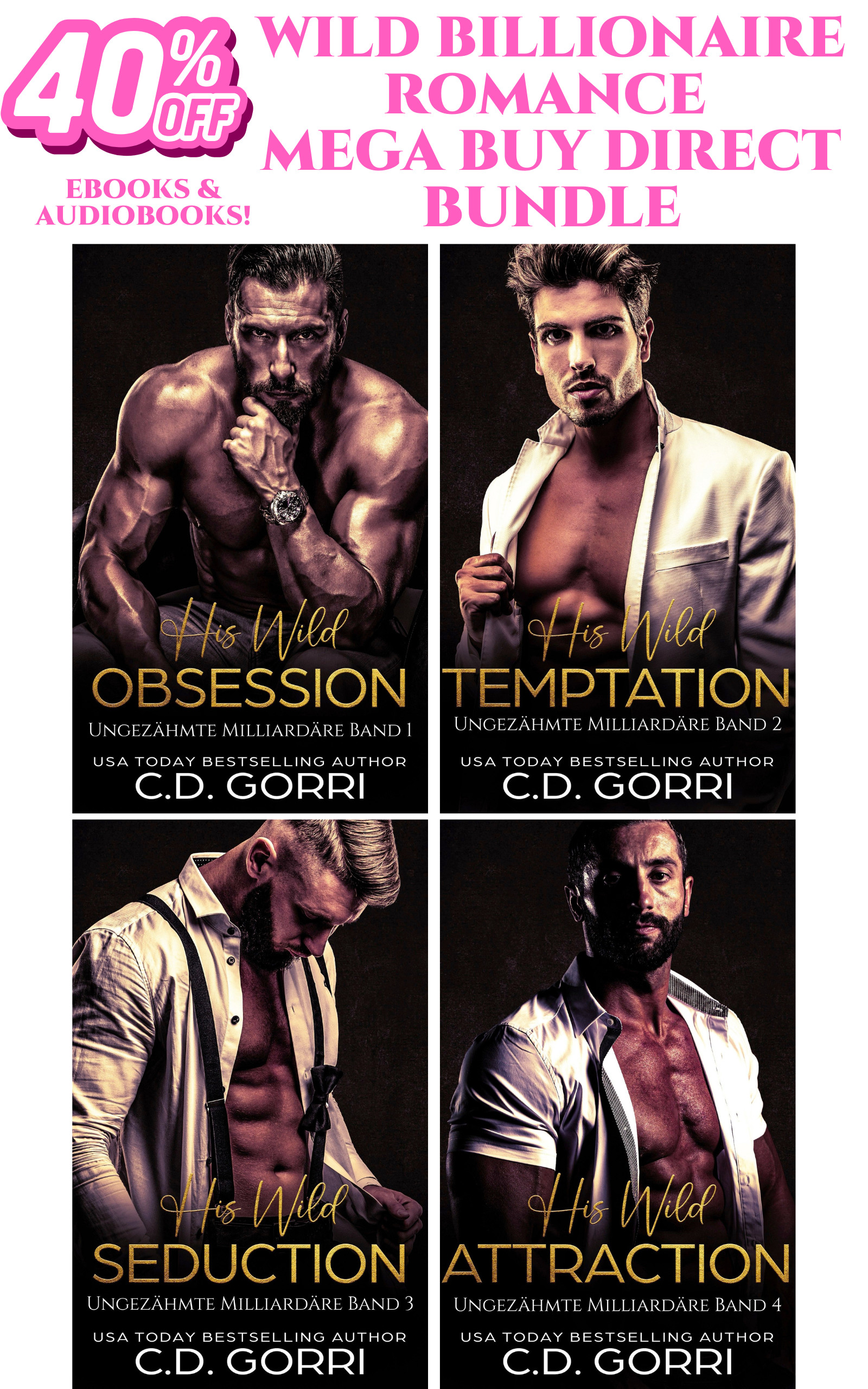 Wild Billionaire Romance Mega Buy Direct Bundle These wild billionaire playboys are used to getting their way… There isn’t much money can’t buy, especially when it comes to pleasure. But can these curvy women tame these billionaire beasts and win their love? Or will their souls be sucked into oblivion by the wanton bliss their bodies crave more and more with every surrender?Each of our heroes wears a mask on the outside to face the world, but his disguise comes off when he runs into the one female who makes his blood run hot. Need and possessive passion abound in these books, but our heroes know only one way to control their desires.Will they f*ck the feeling they see as weakness out of their systems, or will their needs only grow more wild with every touch, kiss, and plunge into ecstasy with the object of his affections? This exclusive BUY DIRECT BUNDLE Includes all 4 eBooks AND all 4 Audiobooks at 40% off the cover price! His Wild ObsessionHe’s a hardened ex-criminal. She’s a stranger to his world. His Wild TemptationShe was a temptation he couldn’t afford, but letting her go was not an option. His Wild SeductionSome debts demand hefty payment. Some loves are too wild to set free. His Wild AttractionShe needed shelter from the storm. He just needed her Popular Tropes Billionaire Romance, Contemporary Romance, Possessive Alpha Male, Obsessed Hero, One Night To Forever, Morally Gray MMC Series Reviews ⭐⭐⭐⭐⭐ “Adrik and Sofia have a wildly passionate “arrangement”. But a time limit is set, which neither wants, but won’t speak to the other about. I thoroughly enjoyed their spicy, dangerous story.” -Bookbub Reviewer⭐⭐⭐⭐⭐”A spicy one! Intense and passionate, dark and dangerous…” -Bookbub Reviewer⭐⭐⭐⭐⭐”Before you read this series, be sure you don’t mind serious sex. There are sections of these books that have some very serious sex that some women have trouble with so please if you can’t handle it don’t buy them. But if you really enjoy that kind of stuff then get all 4 of the series because they are really great 👍. I have read them 3 times and I have enjoyed them every time that I read them. She is a great author. 👍” – Amazon Reviewer